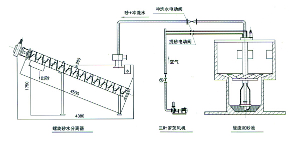 进水从切线方向进入池中,形成旋流,轴向流揽拌机控制水流的流速与流态,水流夹带大量粘附有机物的砂,在浆板搅拌剪切力下互相剥离,依靠砂的自身重力和旋流作用向中心砂斗下沉,剥离的有机物随轴向水流向上溢走。砂斗积聚的砂经空气提升泵或砂泵提升,砂与少量污水进入池外砂水分离器内,砂分离外排,污水回流至格栅井。