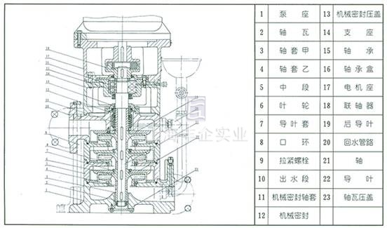 LG型泵的主要零件有:泵座、中段、后段、叶轮、导叶套、导叶、后导叶、支座、电机座、轴、轴承、轴套、密封环、平衡鼓、平衡鼓套等。(25LG、32LG和40LG三种泵没有平衡鼓和平衡套,而设有水封环,装在填料腔的底部)。